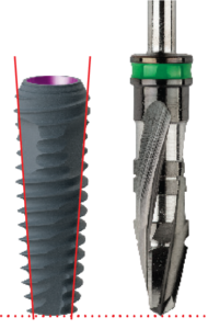 Marked tapered shape of the implant. The shape of an implant matches completely the drill. Initial stability is guaranteed