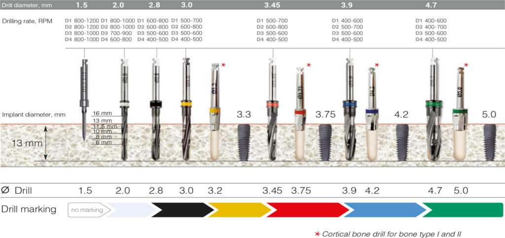 Table of sequential use of conical diamond like coated (DLC) drills
