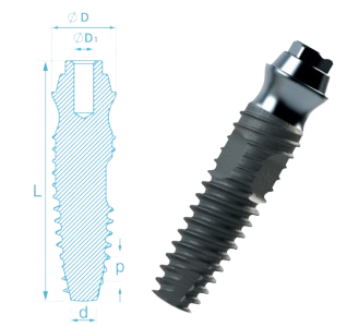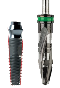 Marked tapered shape of the implant. The shape of an implant matches completely the drill. Initial stability is guaranteed