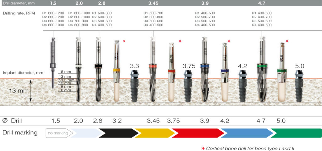 Table of sequential use of conical diamond like coated (DLC) drills